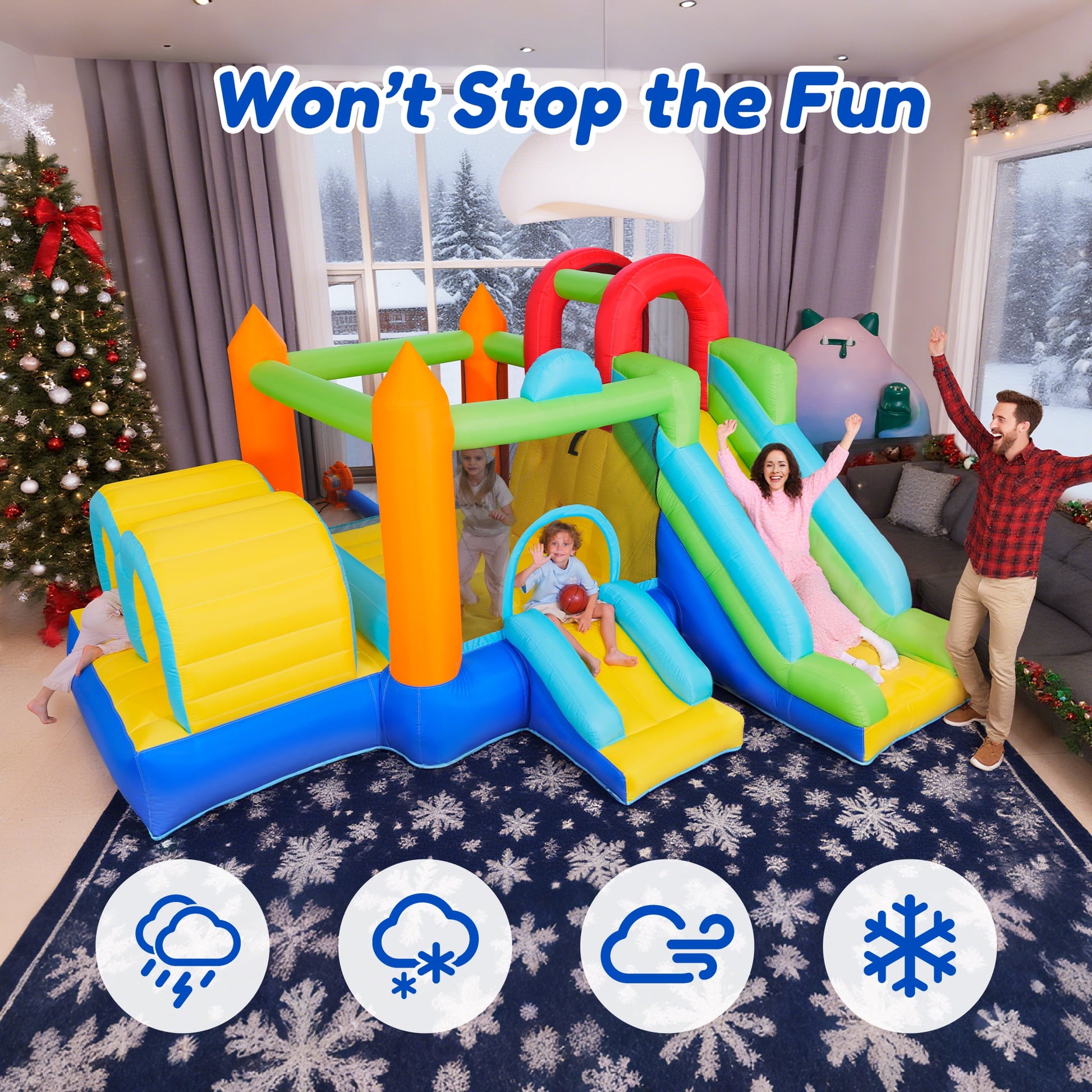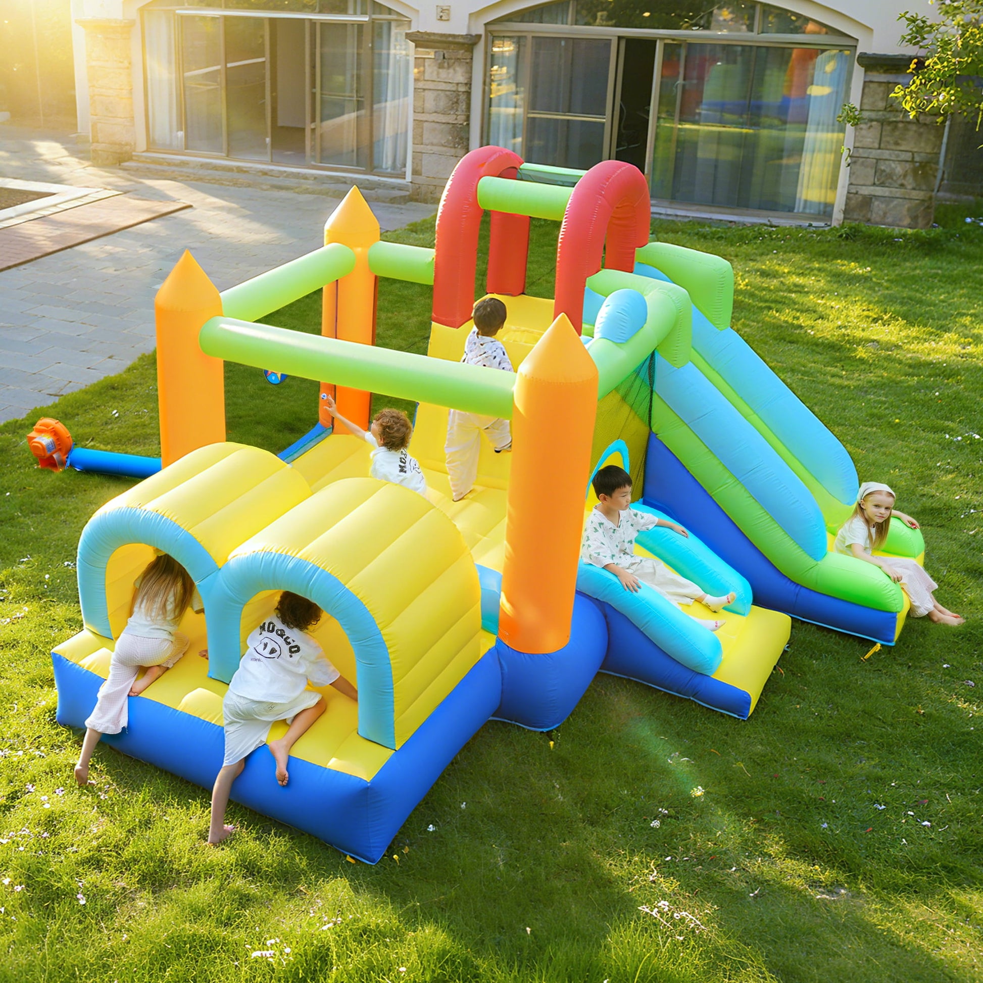 Inflatable Bounce House, 7 in 1 Large Bounce Castle for Kids 3-10, Backyard Jumping Bouncy Castle with Long Slide, Climbing Wall, Tunnel, Trampoline, Children's Outdoor Party - with Blower